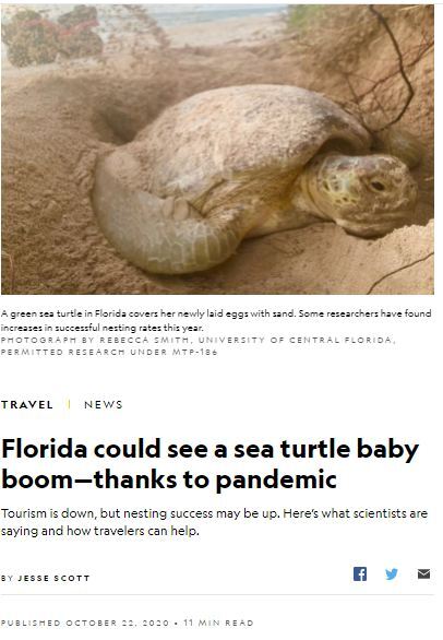 As an animal lover, one of the best things about the pandemic was the many stories of animals in the wild and in zoos breeding more successfully. Turtles around the globe were able to return to traditional nesting sites without the interference of tourists and beach goers. National Geographic published this article about nesting turtles in Florida. Some say the pandemic made a big difference in nesting success, others are less convinced. They also point out that the pandemic has caused increased poaching due to economic hardships. Finally, the article also sheds light on the ongoing problems turtles face due to climate change.