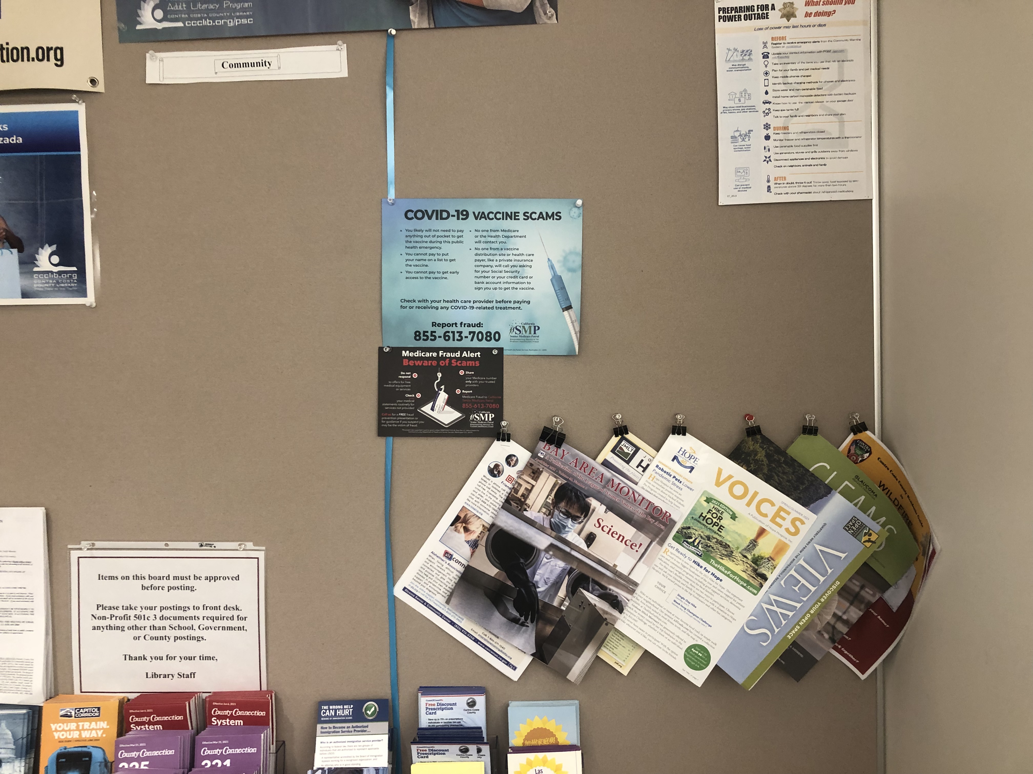 When I visited the library today, I noticed in the large assortment of flyers on the community posting board a flyer warning about COVID-19 scams. The flyer is from the California Senior Medicare Patrol, and mentions a variety of different scams related to vaccine distribution that people should avoid. It also provides a hotline phone number. The photo was taken on June 24, 2021.