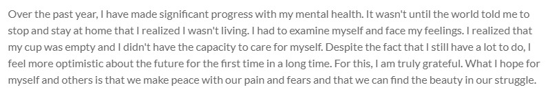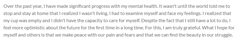 Over the past year, I have made significant progress with my mental health. It wasn't until the world told me to stop and stay at home that I realized I wasn't living. I had to examine myself and face my feelings. I realized that my cup was empty and I didn't have the capacity to care for myself. Despite the fact that I still have a lot to do, I feel more optimistic about the future for the first time in a long time. For this, I am truly grateful. What I hope for myself and others is that we make peace with our pain and fears and that we can find the beauty in our struggle.