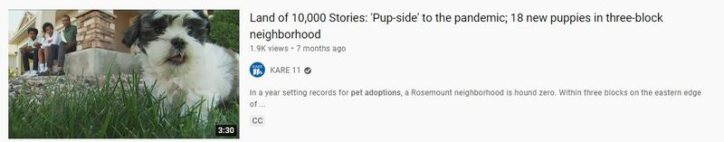 This adorable story uses the example of a neighborhood in Rosemount, Minnesota to demonstrate the trend of families adopting dogs during the pandemic. In this neighborhood, 17 puppies were adopted by 17 families living within 3 blocks of each other, with a surprise 18th at the end of the video.
