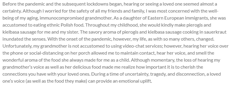 Before the pandemic and the subsequent lockdowns began, hearing or seeing a loved one seemed almost a certainty. Although I worried for the safety of all my friends and family, I was most concerned with the well-being of my aging, immunocompromised grandmother. As a daughter of Eastern European immigrants, she was accustomed to eating ethnic Polish food. Throughout my childhood, she would kindly make pierogis and kielbasa sausage for me and my sister. The savory aroma of pierogis and kielbasa sausage cooking in sauerkraut inundated the senses. With the onset of the pandemic, however, my life, as with so many others, changed. Unfortunately, my grandmother is not accustomed to using video-chat services; however, hearing her voice over the phone or social-distancing on her porch allowed me to maintain contact, hear her voice, and smell the wonderful aroma of the food she always made for me as a child. Although momentary, the loss of hearing my grandmother’s voice as well as her delicious food made me realize how important it is to cherish the connections you have with your loved ones. During a time of uncertainty, tragedy, and disconnection, a loved one’s voice (as well as the food they make) can provide an emotional uplift.