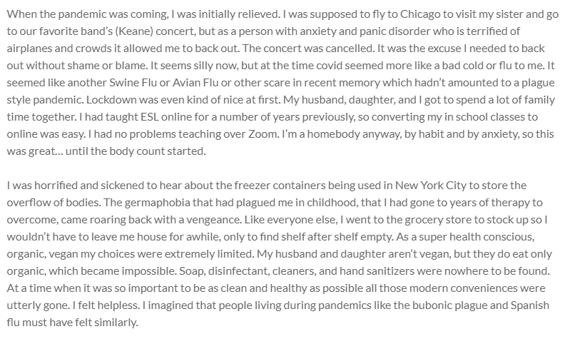 When the pandemic was coming, I was initially relieved. I was supposed to fly to Chicago to visit my sister and go to our favorite band’s (Keane) concert, but as a person with anxiety and panic disorder who is terrified of airplanes and crowds it allowed me to back out. The concert was cancelled. It was the excuse I needed to back out without shame or blame. It seems silly now, but at the time covid seemed more like a bad cold or flu to me. It seemed like another Swine Flu or Avian Flu or other scare in recent memory which hadn’t amounted to a plague style pandemic. Lockdown was even kind of nice at first. My husband, daughter, and I got to spend a lot of family time together. I had taught ESL online for a number of years previously, so converting my in school classes to online was easy. I had no problems teaching over Zoom. I’m a homebody anyway, by habit and by anxiety, so this was great… until the body count started.