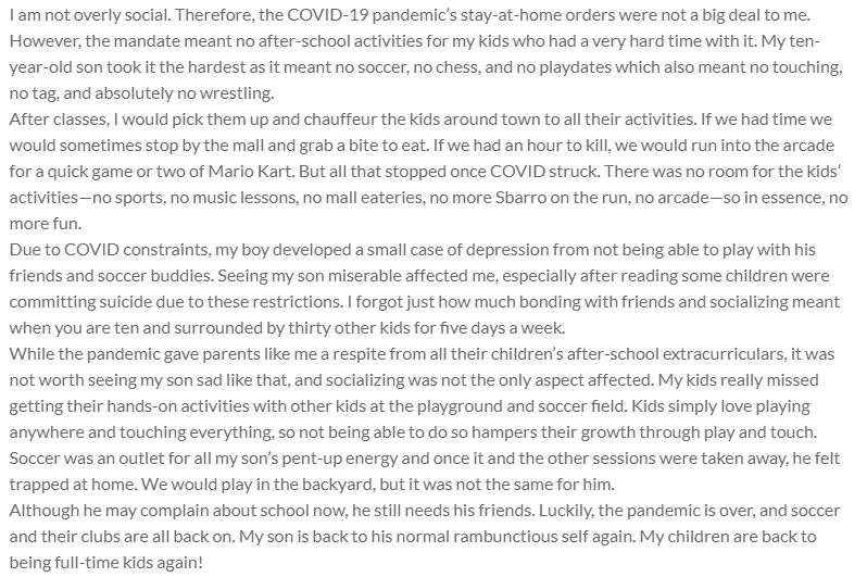 While the pandemic gave parents like me a respite from all their children’s after-school extracurriculars, it was not worth seeing my son sad like that, and socializing was not the only aspect affected. My kids really missed getting their hands-on activities with other kids at the playground and soccer field. Kids simply love playing anywhere and touching everything, so not being able to do so hampers their growth through play and touch. Soccer was an outlet for all my son’s pent-up energy and once it and the other sessions were taken away, he felt trapped at home. We would play in the backyard, but it was not the same for him.