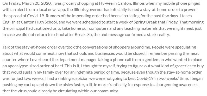 On Friday, March 20, 2020, I was grocery shopping at Hy-Vee in Canton, Illinois when my mobile phone pinged with an alert from a local news app: the Illinois governor had officially issued a stay-at-home order to prevent the spread of Covid-19. Rumors of the impending order had been circulating for the past few days. I teach English at Canton High School, and we were scheduled to start a week of Spring Break that Friday. That morning the principal had cautioned us to take home our computers and any teaching materials that we might need, just in case we did not return to school after Break. So, the text message confirmed a stark reality.