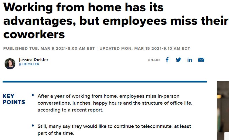 This article and accompanying video discuss what employees miss most in the new teleworking situations created by the pandemic and what aspects of this situation they hope to have addressed after the pandemic recedes. The lack of interaction and socializing with coworkers is viewed as the major disadvantage to teleworking for individuals in the survey cited.