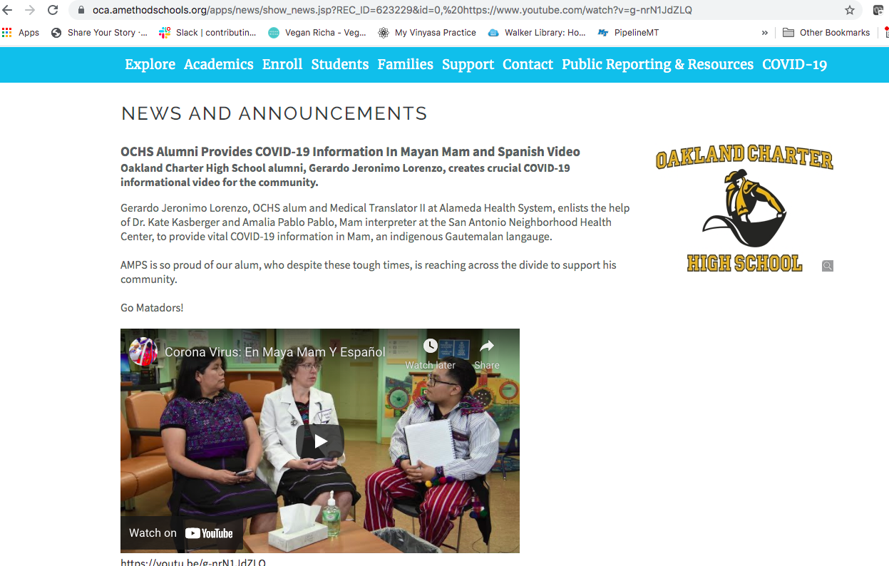 Gerardo Jeronimo Lorenzo, OCHS alum and Medical Translator II at Alameda Health System, enlists the help of Dr. Kate Kasberger and Amalia Pablo Pablo, Mam interpreter at the San Antonio Neighborhood Health Center, to provide vital COVID-19 information in Mam, an indigenous Gautemalan [sic] langauge [sic].