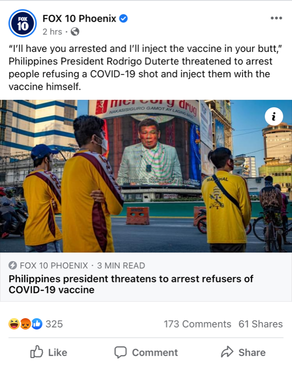 Philippines president threatens to arrest refusers of COVID-19 vaccine
