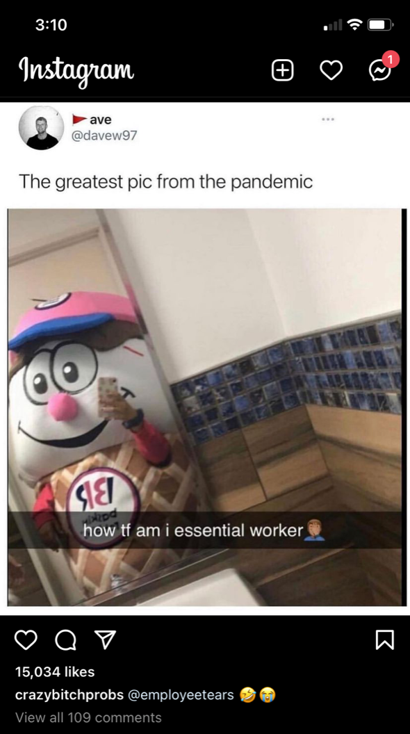This photo got some unexpected comments on Instagram like this one - "In that dark time, you helped people stay positive thru a pandemic man! That was the most essential work then." And this other one "But ice cream was essential during the pandemic! It was basically my only reason to live for a lil while." A lot of people found this picture funny but surprisingly many were quick to point out that it was the simple things, like mascots and ice cream, that kept us all smiling.