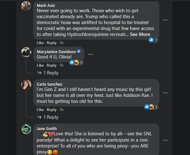 This Facebook comment feed shows a mixed reaction to President Biden's latest effort to get young people vaccinated.