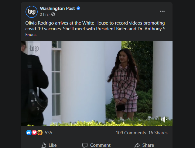 Olivia Rodrigo arrives at the White House to record videos promoting covid-19 vaccines. She'll meet with President Biden and Dr. Anthony S. Fauci.