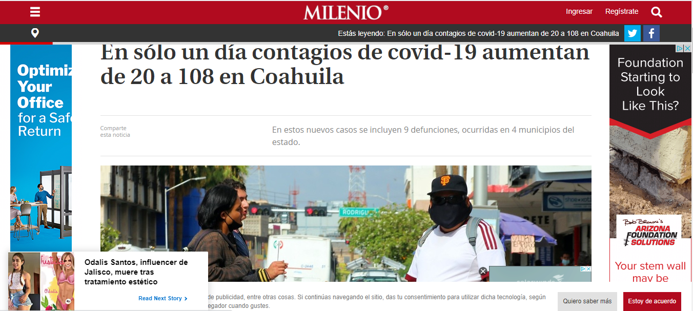 En sólo un día contagios de covid-19 aumentan de 20 a 108 en Coahuila [In just one day covid-19 infections increase from 20 to 108 in Coahuila]