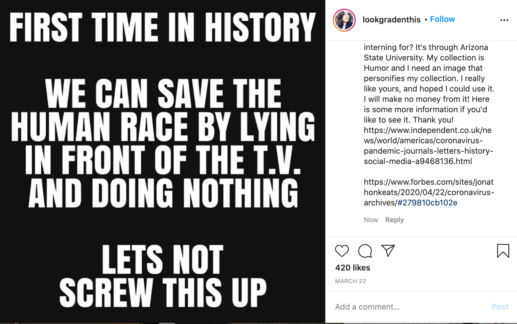 This item was submitted on July 19, 2021 by Lyn Ribisi using the form “Share Your Story” on the site “A Journal of the Plague Year”: https://www.covid-19archive.org/s/archive