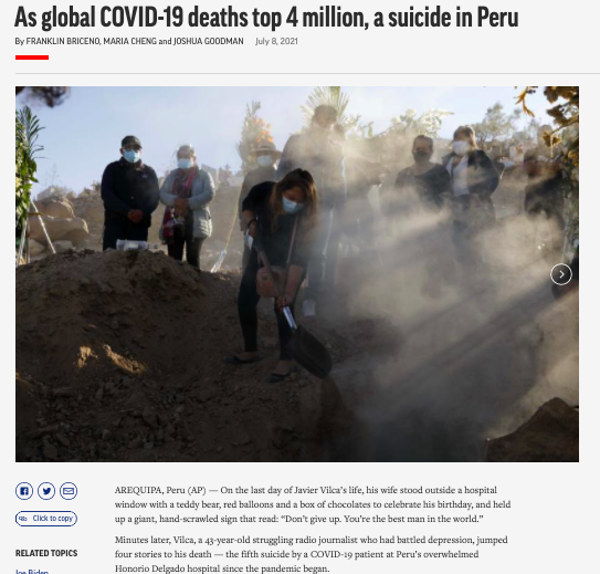 In Peru the pandemic is broiling, things are far from slowing down. Patients with COVID may go to the hospital only to find out that there are not enough ventilators or oxygen to go around. This story by the AP press describes a story of a COVID-related suicide. Although this topic is not widely covered in the U.S. media, it is a consistent storyline in Peru.