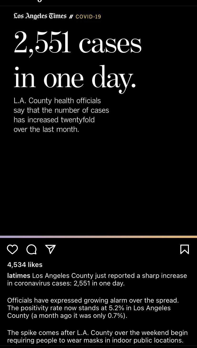 The Los Angeles Times reports "L.A County health officials say the number of cases has increased twentyfold over the last month." Clear evidence that we are not out of the woods, COVID is still around and people are still dying. I wonder if anyone is still paying attention.