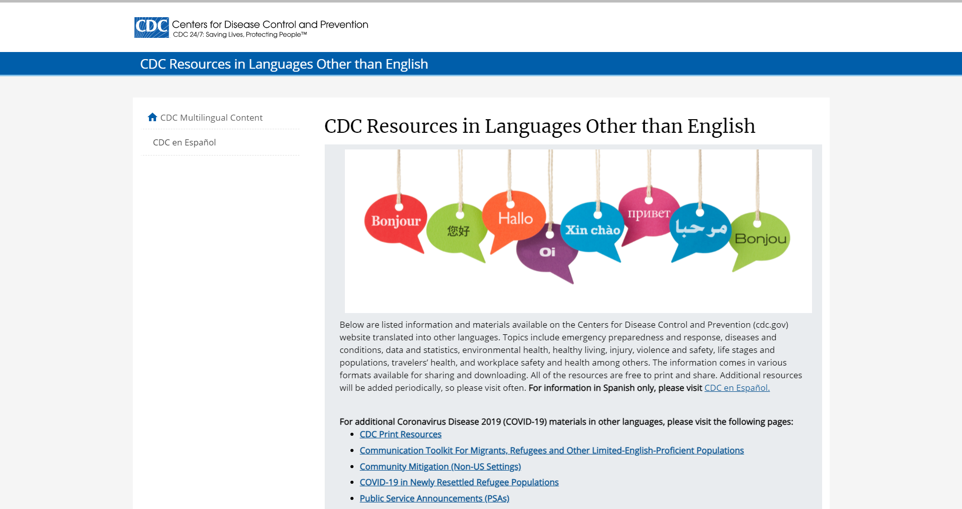 Information on COVID-19 must be available to all individuals if the US as a society and as a country are to successfully deal with this virus and prevent deaths and illness. This information must be available in a variety of languages other than English to meet the needs of those who are not proficient in the English language. The CDC created a website with a wealth of information and materials for individuals in languages other than English, including materials for migrants and refugees. The CDC also has a website for Spanish-speaking individuals.