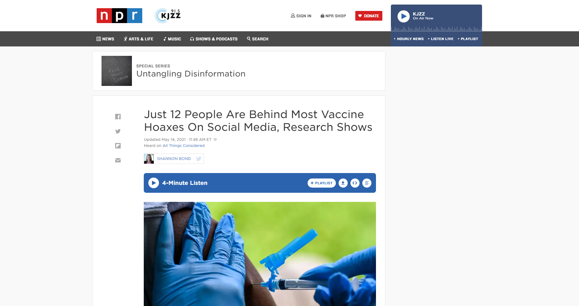 This article discusses "misleading claims and outright lies about COVID-19 vaccines that proliferate on Facebook, Instagram, and Twitter". According to the article, 12 people are behind the majority of the misinformation surrounding COVID and the vaccine that leads to conspiracy theories. Many of these theories have led some social media users to avoid the vaccine and ignore scientific facts.