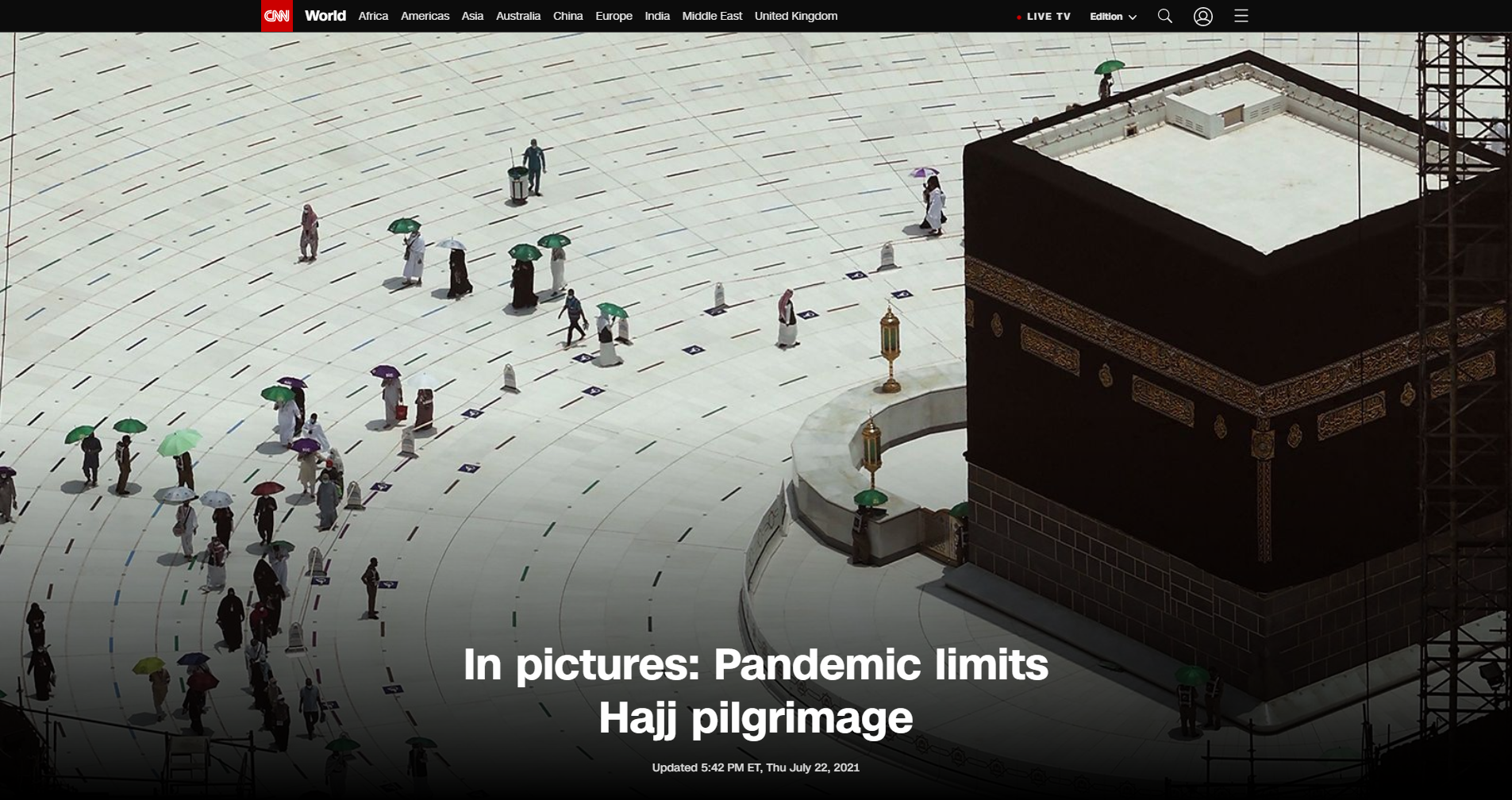 This CNN article/photos show how the Hajj pilgrimage to Mecca is impacted by COVID for the second year in a row. The article states that, typically, 2 million Muslims worldwide go to Mecca for the Hajj, but this year, it is expected that only 60,000 residents will attend. Worshippers must be fully vaccinated and nonresidents are not allowed to attend.