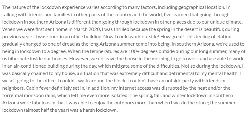 The nature of the lockdown experience varies according to many factors, including geographical location. In talking with friends and families in other parts of the country and the world, I’ve learned that going through lockdown in southern Arizona is different than going through lockdown in other places due to our unique climate. When we were first sent home in March 2020, I was thrilled because the spring in the desert is beautiful; during previous years, I was stuck in an office building. Now I could work outside! How great! This feeling of elation gradually changed to one of dread as the long Arizona summer came into being. In southern Arizona, we’re used to being in lockdown to a degree. When the temperatures are 100+ degrees outside during our long summer, many of us hibernate inside our houses. However, we do leave the house in the morning to go to work and are able to work in an air-conditioned building during the day, which mitigate some of the difficulties. Not so during the lockdown. I was basically chained to my house, a situation that was extremely difficult and detrimental to my mental health. I wasn’t going to the office, I couldn’t walk around the block, I couldn’t have an outside party with friends or neighbors. Cabin fever definitely set in. In addition, my internet access was disrupted by the heat and/or the torrential monsoon rains, which left me even more isolated. The spring, fall, and winter lockdown in southern Arizona were fabulous in that I was able to enjoy the outdoors more than when I was in the office; the summer lockdown (almost half the year) was a harsh lockdown.