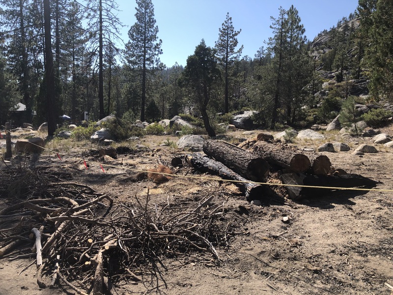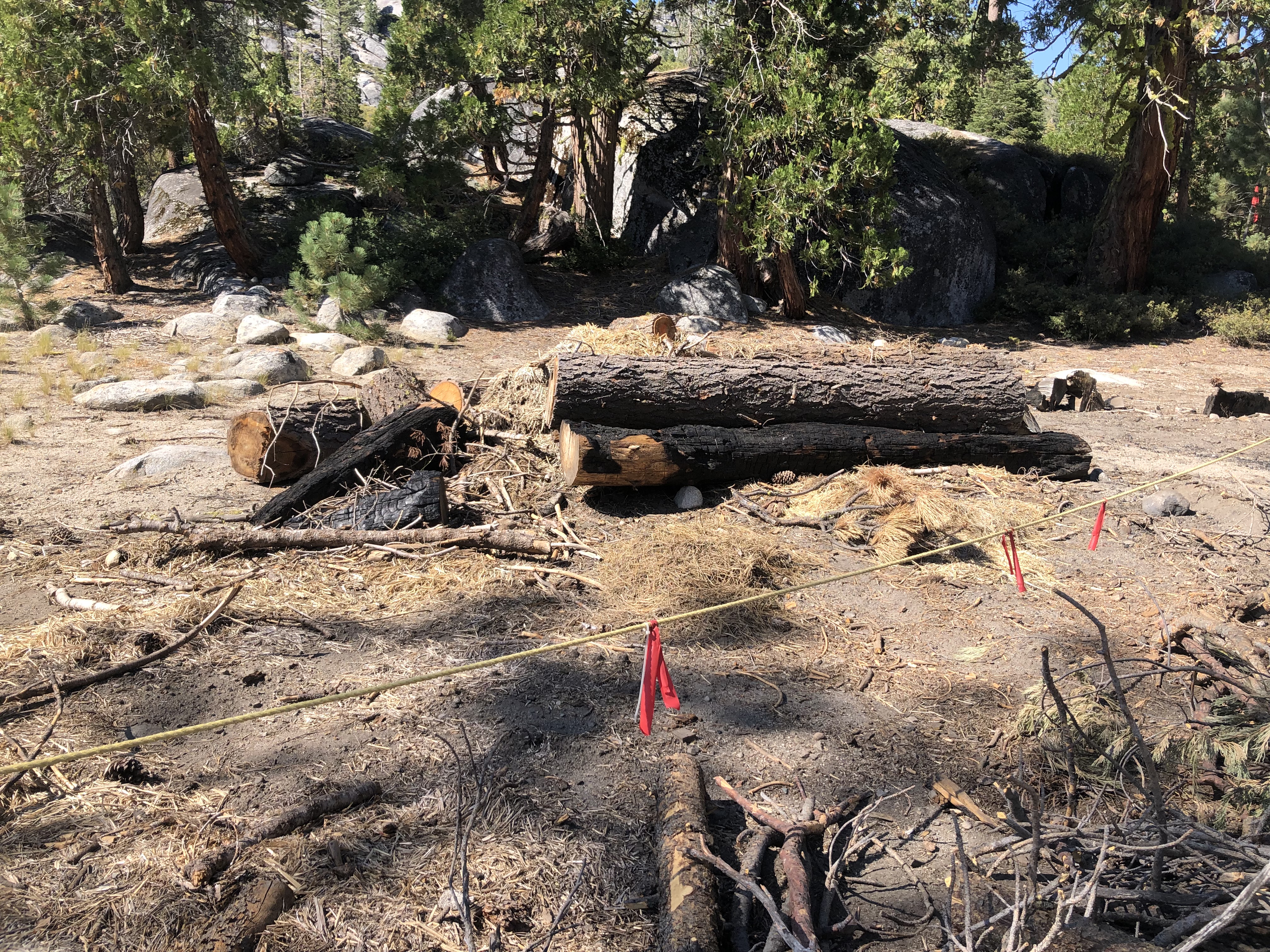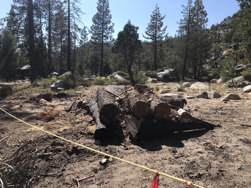 These are three photos of a set of logs, located between the archery range and shotgun range at Camp Wolfeboro. In all of the photos the Handicraft building is visible on the left in the distance. According to the in-camp president of the Wolfeboro Pioneers, the pile of logs was created as a burn pile by the Forest Service. At the 7:30 Pioneer meeting on Monday evening, July 19th, 2021, a Scout proposed clearing the burn pile as part of the Wolfeboro Work Party, an hour-long work party running from 7:30 to 8:30 on every Tuesday night at camp where each Scout troop helps clean up part of camp. He didn't know the pile was made by the Forest Service, so the president said so and said the camp couldn't clear it.