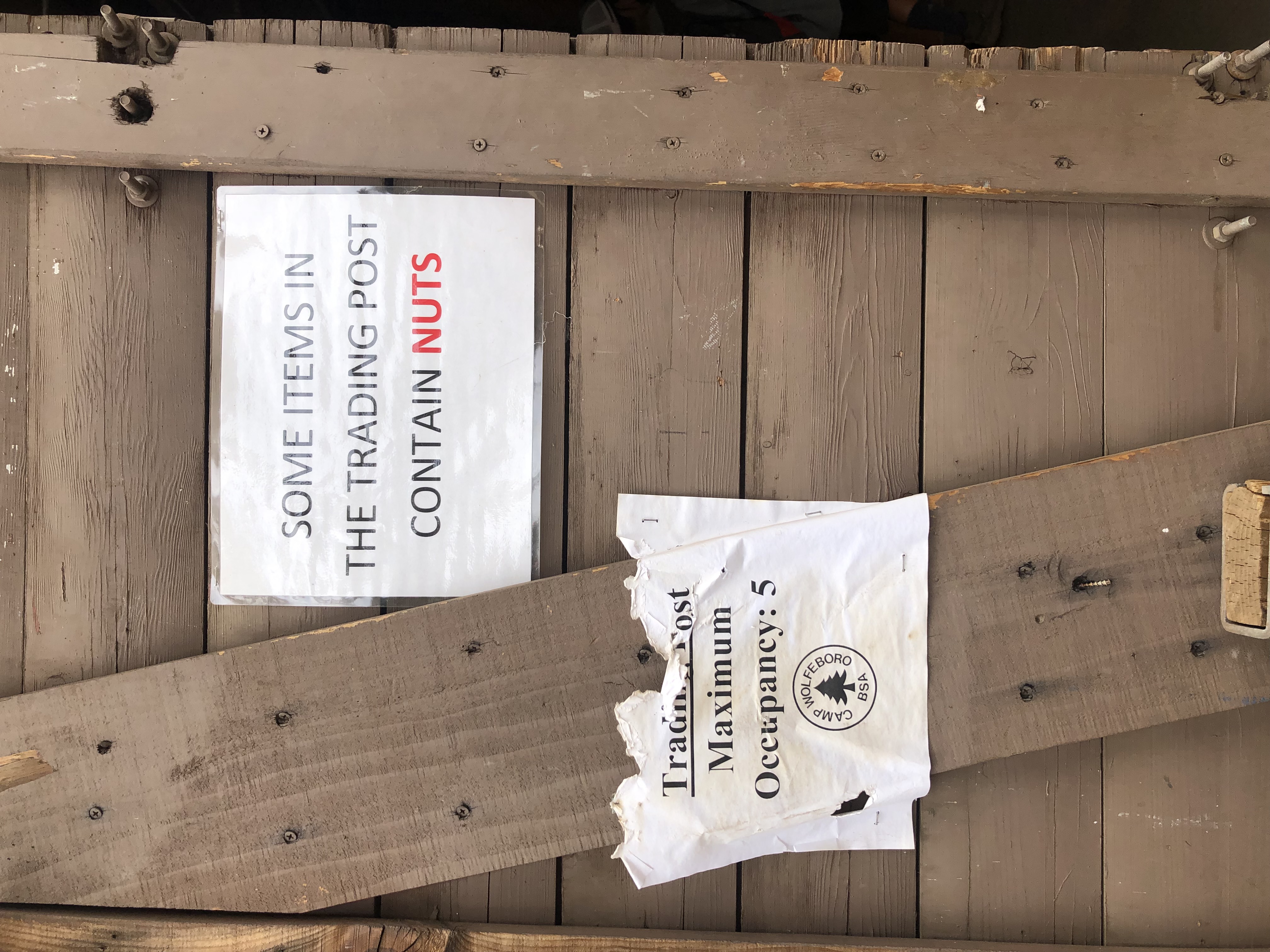 This photograph shows a sign at the Camp Wolfeboro Trading Post that says "Trading Post Maximum Occupancy: 5", with the Camp Wolfeboro logo before it. The sign also accompanies a nut allergy sign that is present every year. The Trading Post only allowed five people to enter at a time, and any overflow had to wait outside for someone to leave the building. Masks were also required in the Trading Post, regardless of vaccination status.