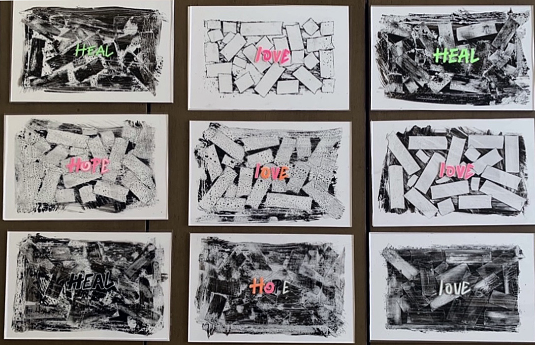 “Hope Love Heal” is a series of 30 separate artworks. Each mail art piece was made with the hope that it would inspire the recipient to seek out mental health care as one way of dealing with the pandemic. Each artwork was hand made with love.