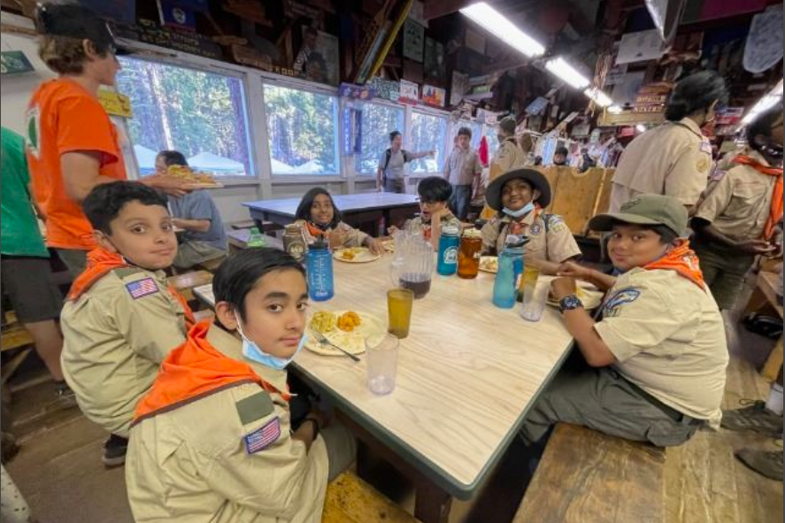 This is a photo of some Scouts from Troop 621, in San Ramon, eating dinner at the Camp Wolfeboro mess hall. The Scouts have masks around their necks. The photo was found on the troop's public website.