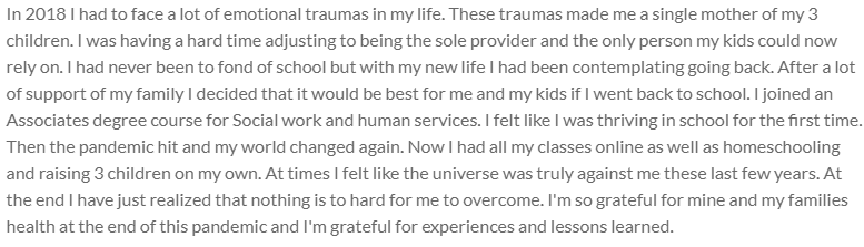 In 2018 I had to face a lot of emotional traumas in my life. These traumas made me a single mother of my 3 children. I was having a hard time adjusting to being the sole provider and the only person my kids could now rely on. I had never been to fond of school but with my new life I had been contemplating going back. After a lot of support of my family I decided that it would be best for me and my kids if I went back to school. I joined an Associates degree course for Social work and human services. I felt like I was thriving in school for the first time. Then the pandemic hit and my world changed again. Now I had all my classes online as well as homeschooling and raising 3 children on my own. At times I felt like the universe was truly against me these last few years. At the end I have just realized that nothing is to hard for me to overcome. I'm so grateful for mine and my families health at the end of this pandemic and I'm grateful for experiences and lessons learned.
