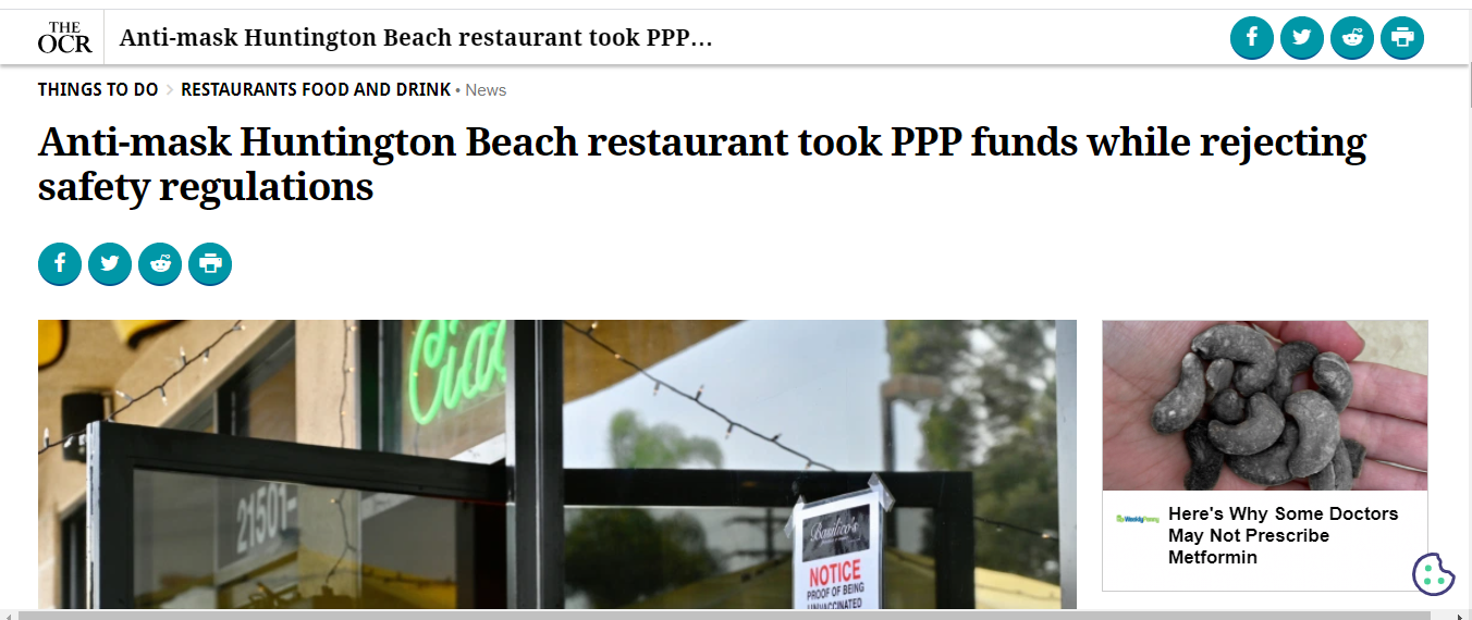 After submitting a restaurant's sign promoting their anti-vax stance I was curious as to whether or not they were still in business. It turns out this restaurant has made quite a buzz in California. They unapologetically promote misinformation and publically prefer their customers to be unvaccinated but happily took thousands in PPP funds. They have spent money on controversial billboards and are not at risk of losing their liquor license. I'm so interested to see where else this story goes. The last sentence of this article sums up the ignorance of the restaurant owner - “Our stand is for all Americans,” wrote Roman. “They can thank us later.”