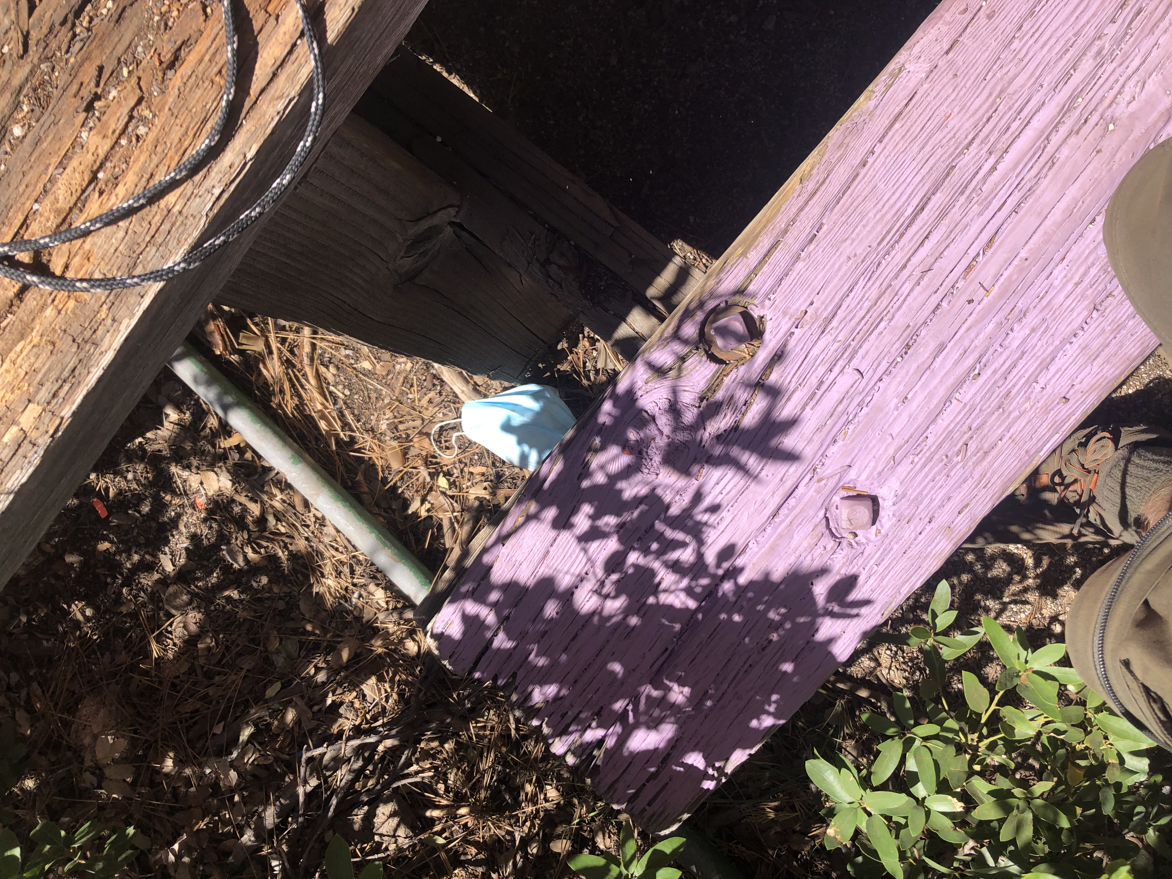 In addition to finding mask trash at my campsite and in the common areas that Scouts and Scouters (adults in Scouting) walk through, I also found mask trash at program areas (meaning areas where merit badge sessions and other Scouting activities take place), like the shotgun range. Like the other photos, I picked up the mask after I took the photo. I am not as disappointed about this littered mask as I am about the others because it was in a fairly hidden location under a bench and I think most people at the range wouldn't have seen it.