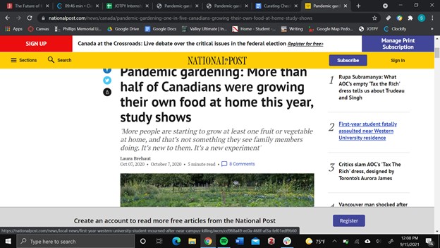 Gardening and growing one's own food became more widespread during the pandemic, led by worries about food shortages and prices along with the desire to engage in new hobbies during the pandemic. This article discusses a study done by Dalhousie University regarding Canadians' growing their own food during the pandemic and compares the current gardening trend with the victory gardens prevalent during World War II.