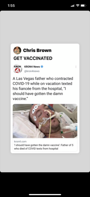 "A Las Vegas father who contracted COVID-19 while on vacation texted his finance from the hospital, "I should have gotten the damn vaccine" This sad story came across my social media feed, I took a screenshot and then found an article which I attached to this item for the full story.