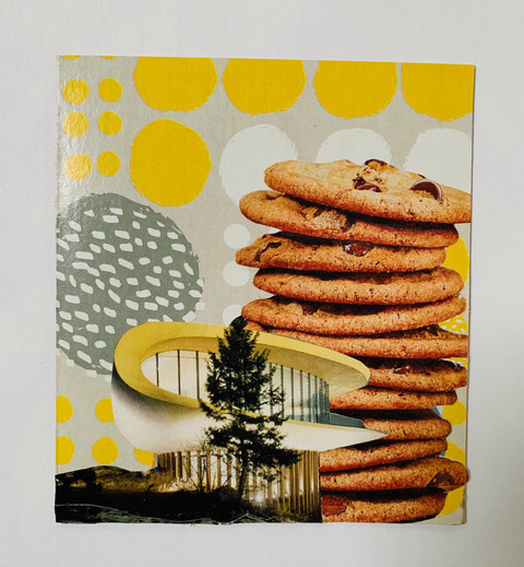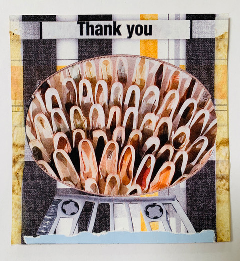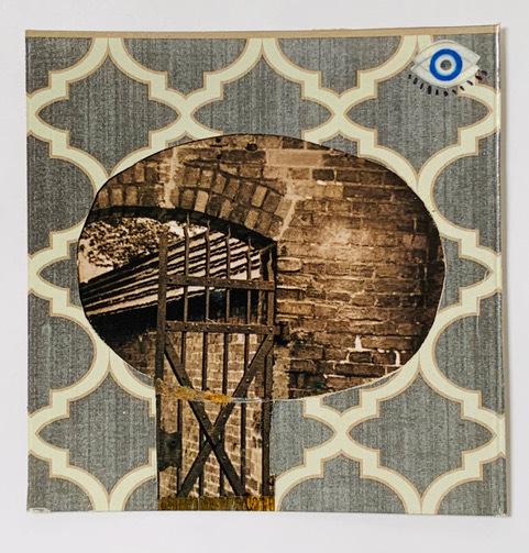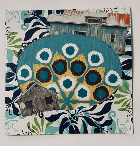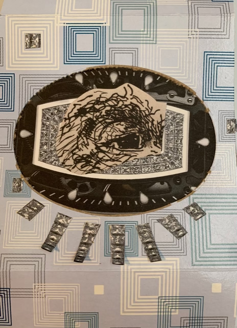 Using the cool patterns on the panels of tissue boxes, I thought that material appropriate. Most of these collaged images appropriate an eye form, much like the Turkish Evil Eye, when given as a gift it offers protection.