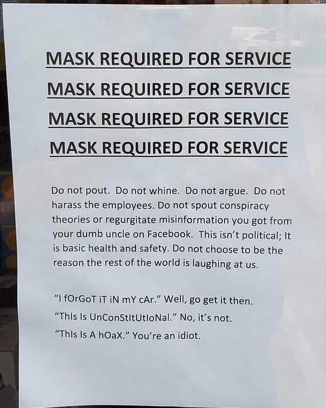 Signs have become so common these days that I often catch myself making sure if a business requires masks or prefers customers not to (I've seen those too). I take an extra moment to enjoy personalized signs like these. I love the solutions to the dumb questions at the end. If everyone would just wear a mask I wonder how low our numbers would be. My favorite part is the last sentence of the paragraph "Do not choose to be the reason the rest of the world is laughing at us."