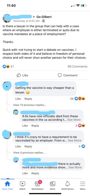 I came across this conversation on Facebook yesterday. I thought it was a good portrayal of what's going on in society today. As everyone is trying to get back to "normal" businesses are starting to require their employees to get vaccinated. Although most people who are fighting this option hardly ever admit that there are actually three options - get vaccinated, get tested regularly, or find a new job. I found it interesting that the original poster revised his original post to add that he was not looking to debate the vaccine even though it's clear what happened.