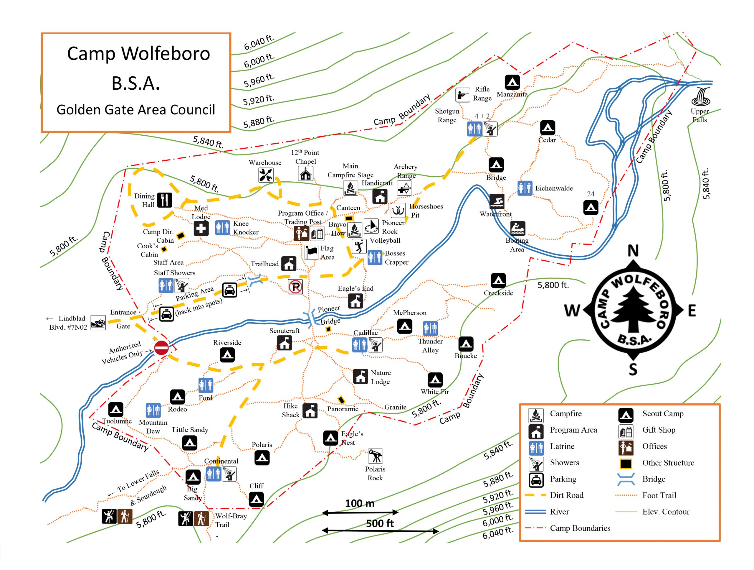 This is a map of Camp Wolfeboro that was on the Golden Gate Area Council website during the summer of 2021. The map includes the various paths and trails, as well as the program areas, buildings, and campfires.