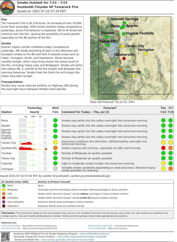 This is a report from the USFS Wildland Fire Quality Response Program outlining the expected air quality impact of the Tamarack Fire near Lake Tahoe from Thursday-Friday, July 22-23, 2021. The reports discusses the possibility of increased smoke in the areas south of the Tamarack Fire, which includes Camp Wolfeboro. The report also notes the fire on Thursday had increased over 10,000 acres in size from the day before.