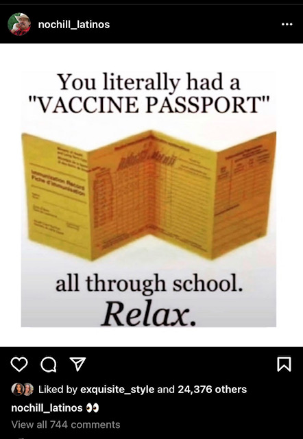 The Instagram page nochill_latinos share a meme directed at those who are making a big deal that vaccine cards are being required at schools and places of work.
