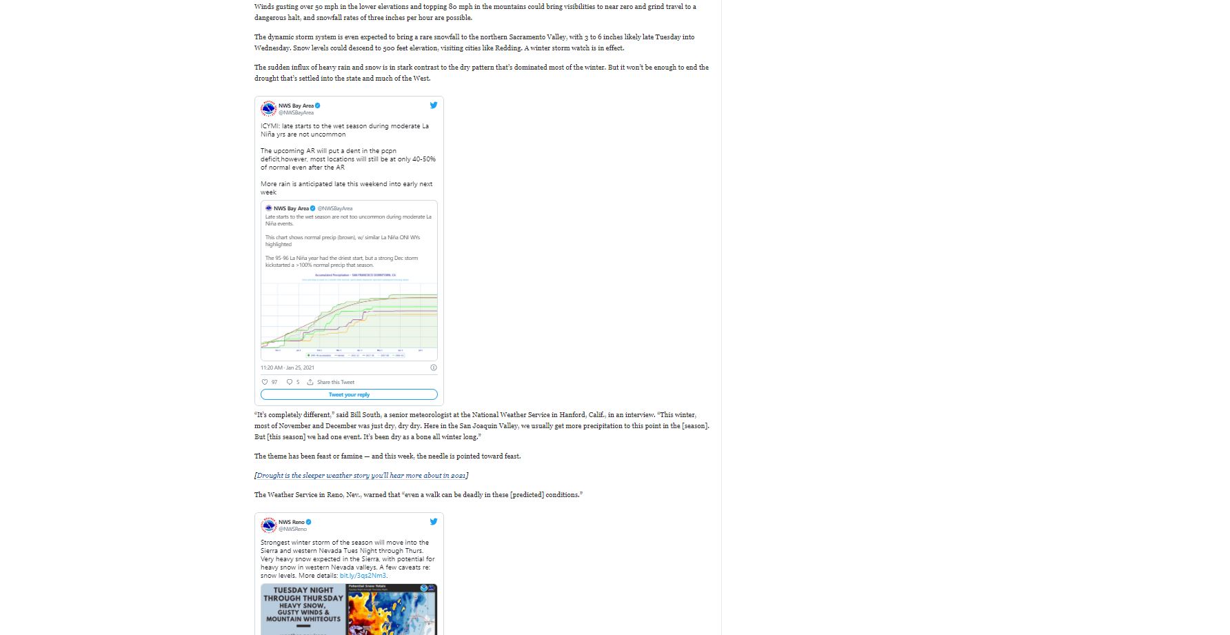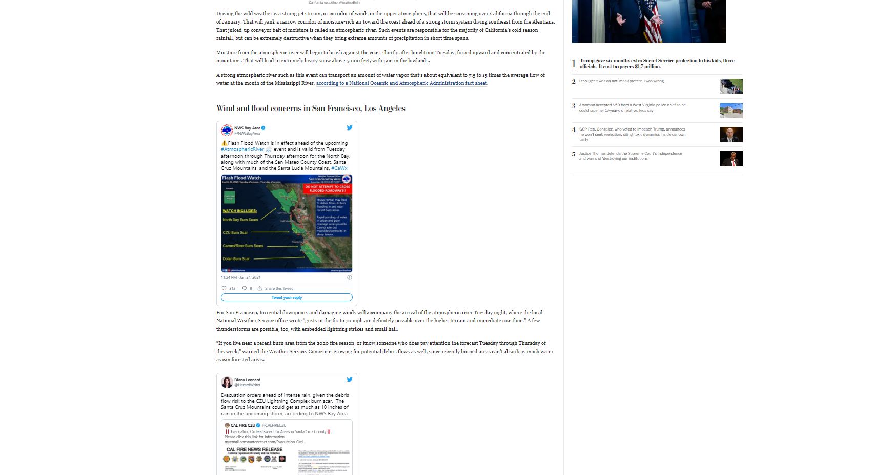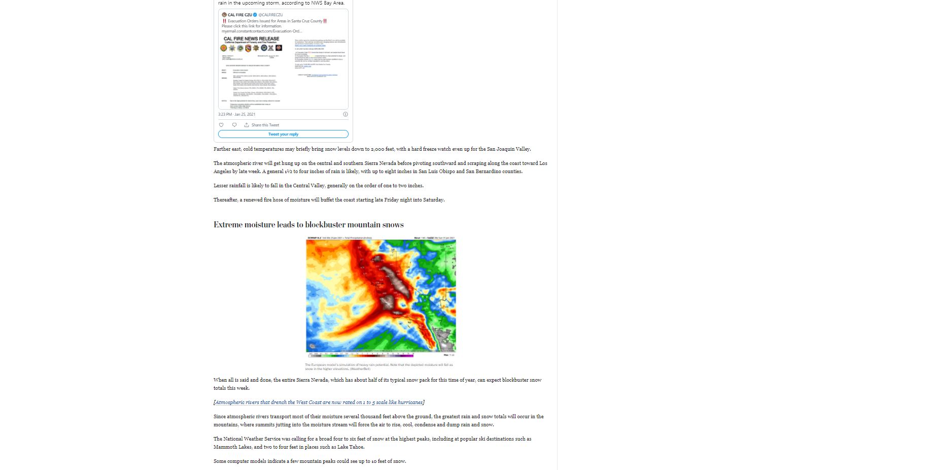 This article from the Washington Post discusses the possibility of snowstorms in the Sierra Nevadas at the end of January 2021. The article specifically mentions that the Sierra Nevada could see up to ten feet of snow. The article also forecasts the possibility of 80-mile-per-hour winds in California's eastern mountains. These storms turned out to be real and damaged Camp Wolfeboro's infrastructure.