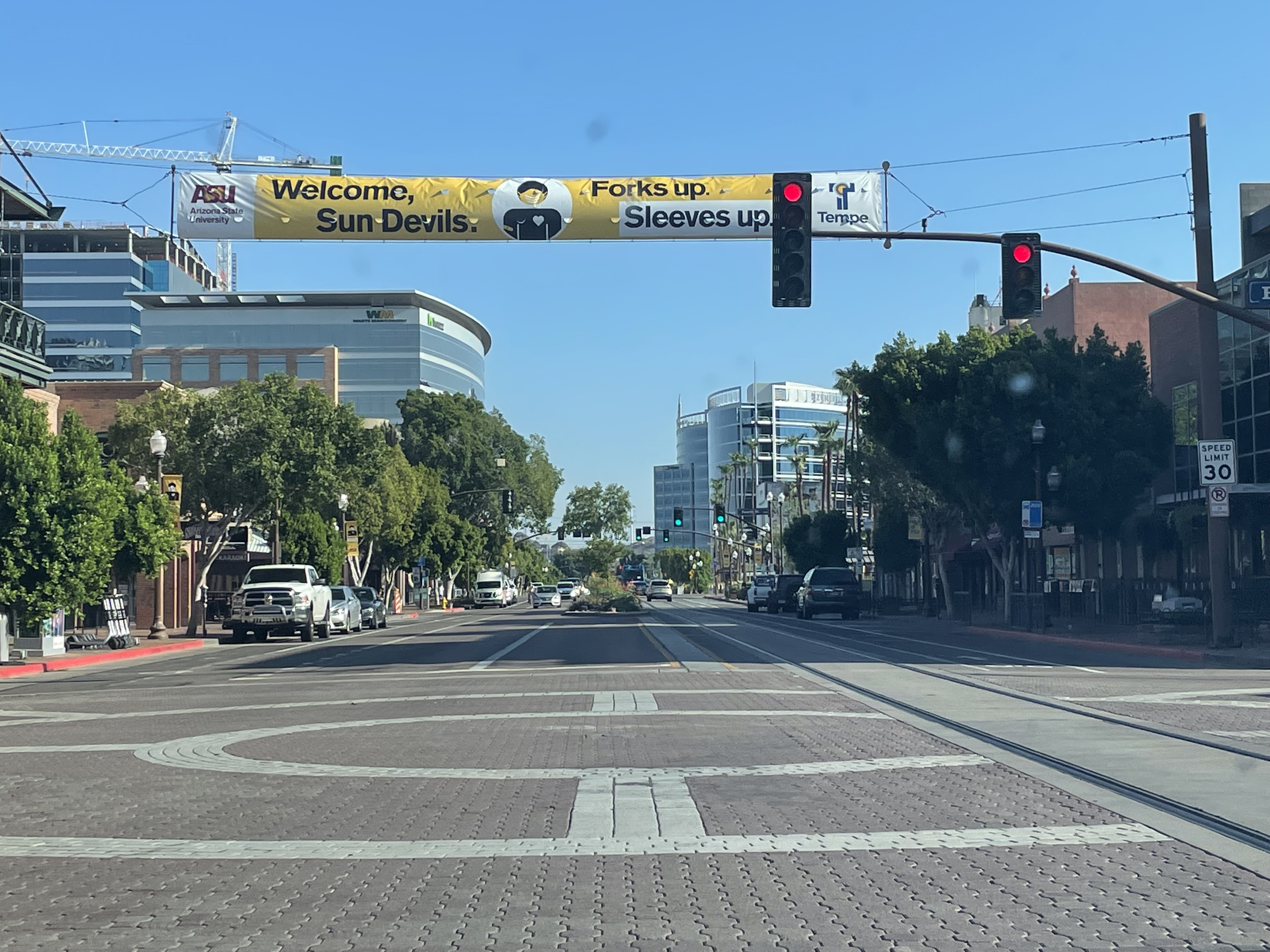 Classes at ASU started last week, since then, this banner has been hanging over the intersection of Mill and 5th in downtown Tempe. It reads, "Welcome Sun Devils, Forks up sleeves up." This banner is meant to encourage people moving through the area to get the COVID-19 vaccine.
