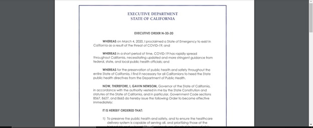 This is the executive order from California Governor Gavin Newsom that introduced California's shelter-in-place on March 19, 2020. The executive order orders Californians to stay at home and only leave home for necessities (buying food, health care, etc.) or for working in certain industries.