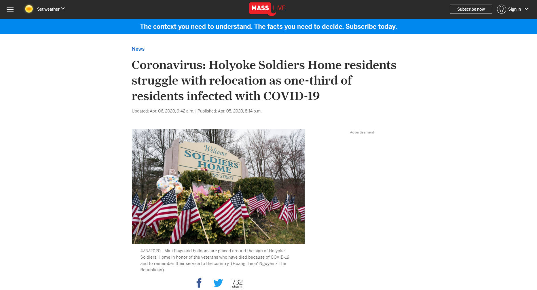This article produced by MassLive reports on the efforts to relocate residents from the Holyoke Soldiers' Home in Holyoke, Massachusetts, to Holyoke Medical Center in attempt to mitigate the spread of the virus after 76 of the 210 residents had already tested positive. The article also discusses the continued investigation into the COVID-19 situation at the home.