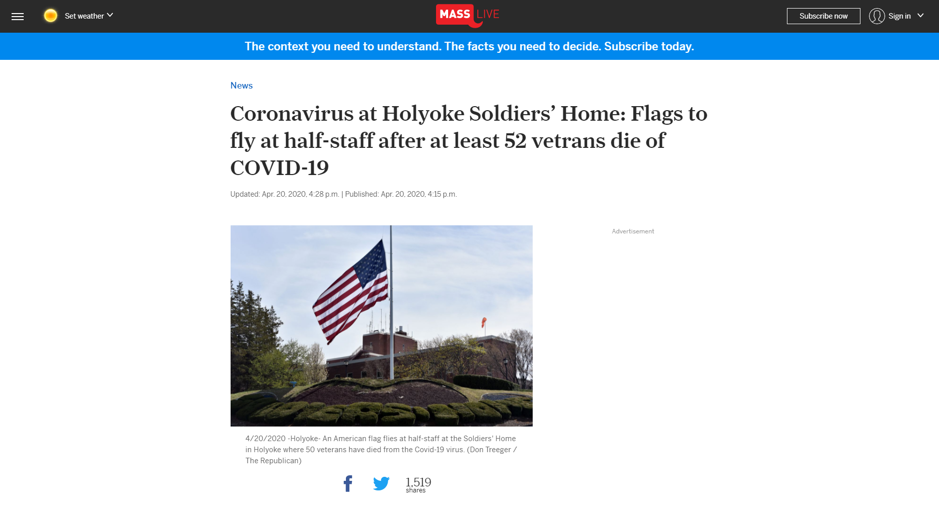 This article, produced by MassLive, reports on Massachusetts Governor Charlie Baker's decision to have flags flown at half-mast at the Holyoke Soldiers' Home in Holyoke, Massachusetts, to commemorate the veterans who had died at the facility from COVID-19.
