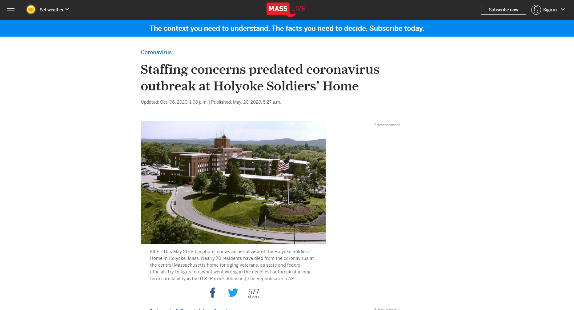 This MassLive article reports on a pre-existing staffing shortage at the Holyoke Soldiers' Home in Holyoke, Massachusetts, that influenced the gravity of the COVID-19 outbreak in the facility.