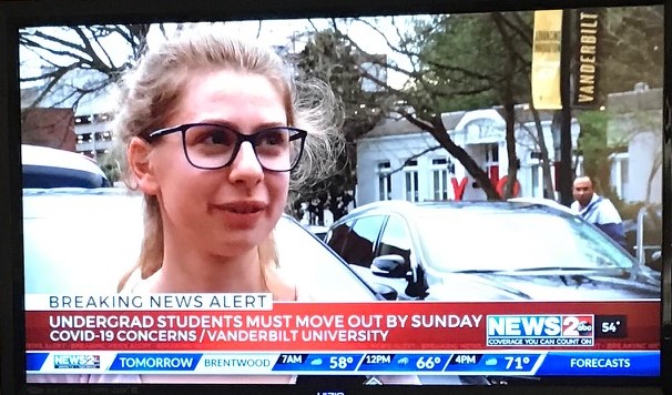 This is a photo of an ABC news segment that was aired on March 11th, 2020, at the very beginning of the pandemic in the United States. The photo shows an interview of a Vanderbilt student (me!). The caption reads “Undergrad Students Must Move out by Sunday”. The interview was taken on a Wednesday, which had been the day that the students were notified that they would need to vacate the campus. The Monday of that week, March 9th, had been our first day after spring break. That same day, we received the first email about the Coronavirus. It stated that classes would be cancelled for the next two weeks. At that time, some students and parents began to panic. Some students decided to leave campus for those two weeks, and believed that they would simply return after those two weeks. These students only took the belongings that they would need for those two weeks, and many of them left the majority of their things in their rooms. Two days later, on the Wednesday of that week, the students received a second email that we would all need to leave campus, and that we had until that Sunday to move all of things out entirely. Naturally, mass chaos ensued as students struggled to figure out how to move all of their things. Most students did not have any help from parents or family, as many people were afraid to travel. This time was a blur of stress, fear, and sadness as students mourned the year that was left unfinished. It was a charged frenzy of packing and moving, but despite this, all around the Vanderbilt’s campus, friends could be seen hugging and crying, particularly the graduating seniors. It was truly surreal in the worst way possible.