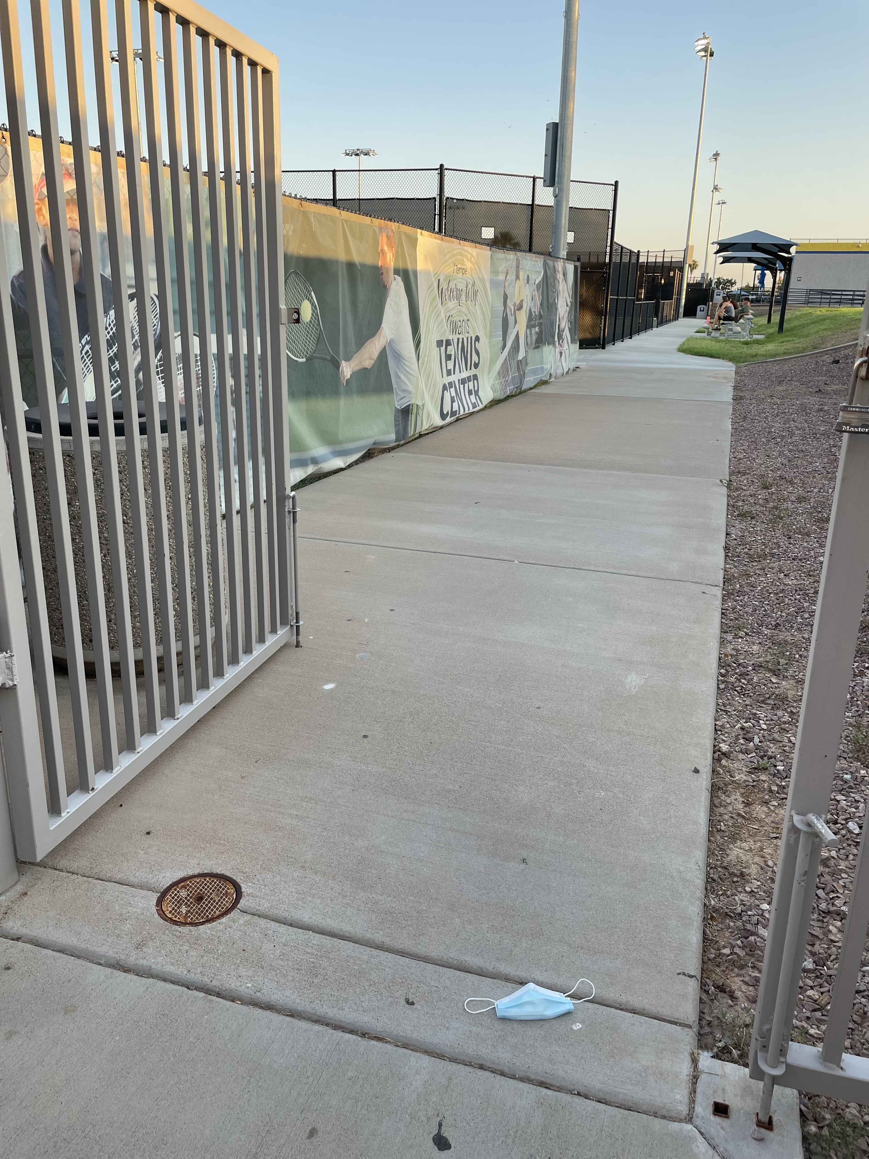 I took my daughter to play tennis at 5:00 PM. When we left at 6:00, this disposable mask had made its way to the ground, right by the entrance to the tennis courts.