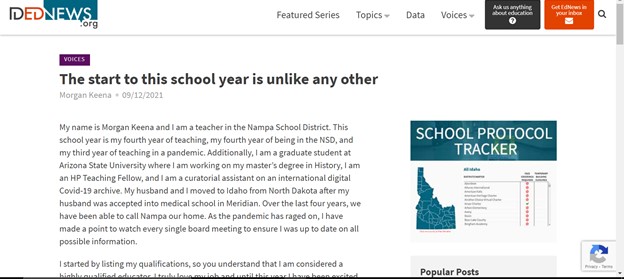 The article was published on Tuesday, September 14, 2021, and Idaho Ed News shared it on their Facebook page as well. Shortly after 7 pm MST the post has over 160 comments (mostly in favor of teachers), 250 reactions, and over 50 shares. In addition, I have received numerous private messages and emails from other teachers who thank me for giving them a voice during this 'unprecedented' time. While I am still a fairly new teacher with only 3 years of experience, there are veteran teachers who are being pushed to the brink. Many would like to think this is an Idaho problem but the reality is that teachers across the country are feeling unsupported and unappreciated by the communities they serve. I am fearful this will be my last year teaching - I LOVE my job. I remain hopeful that this year turns out to be something amazing.