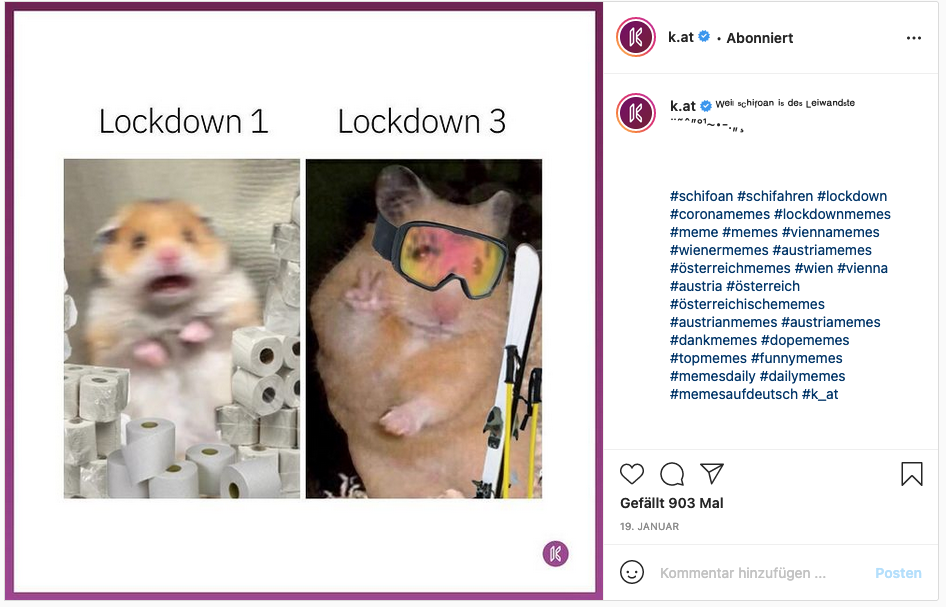 I saw this meme in January 2021. It was created by an Austrian online news platform called "k.at" and was posted on their Instagram channel. The first picture on the left shows a hamster who is hoarding (or rather "hamstering") toilet paper. This showcases a phenomenon which occurred in Austria as well as in Germany: some people bought as much toilet paper as they could in the beginning of the pandemic out of fear of a lockdown (also other things as e.g. noodles, rice etc.). The result was that most people couldn't buy any toilet paper because it was sold out at most places and the manufacturers of toilet paper couldn't keep up with the production. It was kind of absurd.