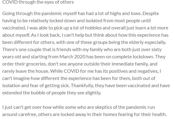 Going through the pandemic myself has had a lot of highs and lows. Despite having to be relatively locked down and isolated from most people until vaccinated, I was able to pick up a lot of hobbies and overall just learn a lot more about myself. As I look back, I can't help but think about how this experience has been different for others, with one of these groups being the elderly especially. There's one couple that is friends with my family who are both just over sixty years old and starting from March 2020 has been on complete lockdown. They order their groceries, don't see anyone outside their immediate family, and rarely leave the house. While COVID for me has its positives and negatives, I can't imagine how different the experience has been for them, both out of isolation and fear of getting sick. Thankfully, they have been vaccinated and have extended the bubble of people they see slightly.