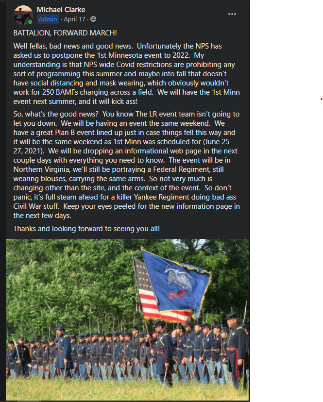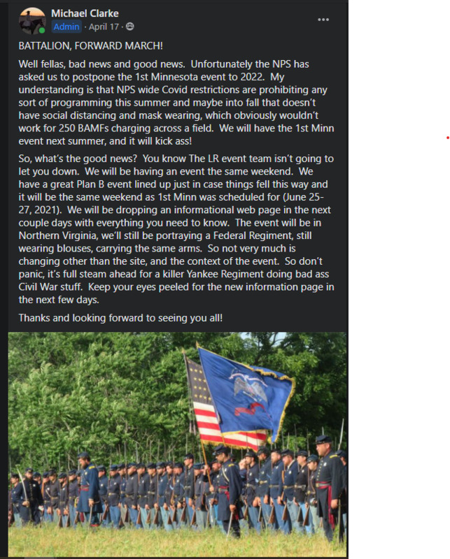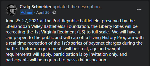 In February I registered for the 1st Minnesota living history event organized by the Liberty Rifles. The idea behind it was that we would create an interactive living history event in conjunction with the National Park Service for the public at the Gettysburg battlefield. At the time, I hadn't been apart of an authentic event before, nor had I been to Gettysburg, so I was really excited for the event. I spent something like $800 improving my impression and so that I could be sure I met the uniform standards and guidelines. Unfortunately, two months before the event the NPS canceled it over Covid concerns. Needless to say, everyone was pretty bummed about it, but the LR event organizers had a plan B event in mind, so a few days after the news of Gettysburg being canceled we were told about the Hell Spot at the Port Republic event, and that we were going to portray the 1st Virginia Infantry (US). Covid cancelled a lot of events in the hobby, and for most of 2020 nothing was happening, much to our dissapointment.