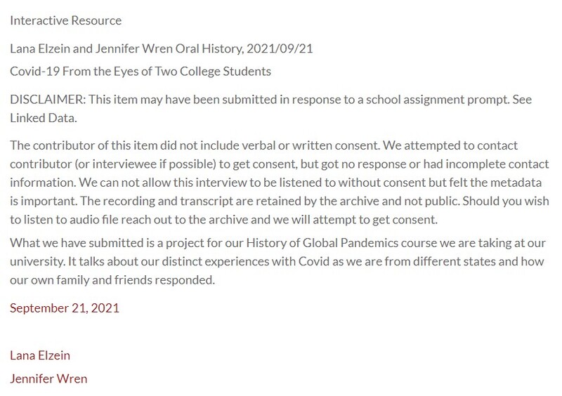 What we have submitted is a project for our History of Global Pandemics course we are taking at our university. It talks about our distinct experiences with Covid as we are from different states and how our own family and friends responded.